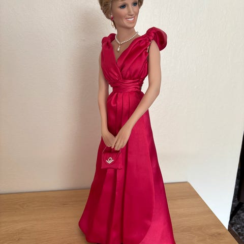 Håndlavet Aston Drake dukke. Prinsesse Diana i beige kjole med taske øreringe og tiara. Kommer med dukkeholder så den kan stå op. Højde 50 cm.