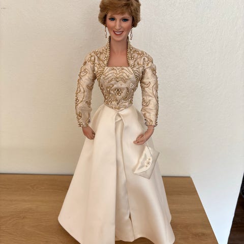 Håndlavet Ashton Drake dukke. Prinsesse Diana i pink kjole med håndtaske, perlekæde, øreringe og tiara. Kommer med holder så dukken kan stå op. 50 cm høj