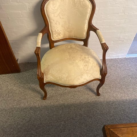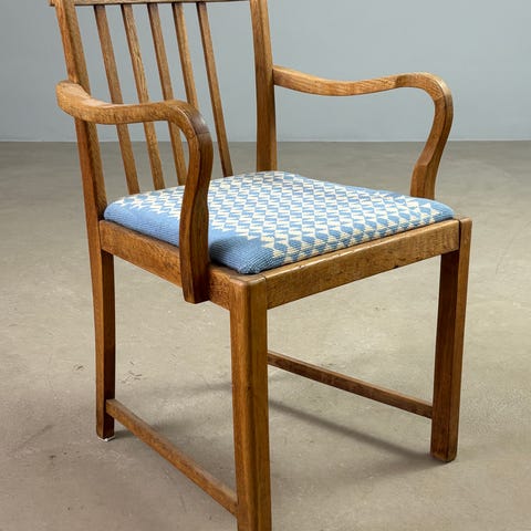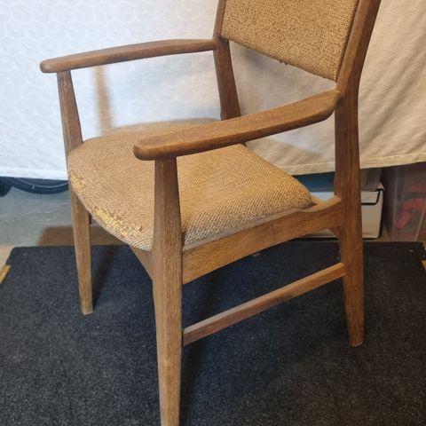 Fin gammel snedker egetræs stol med smukke detaljer og flot betræk.