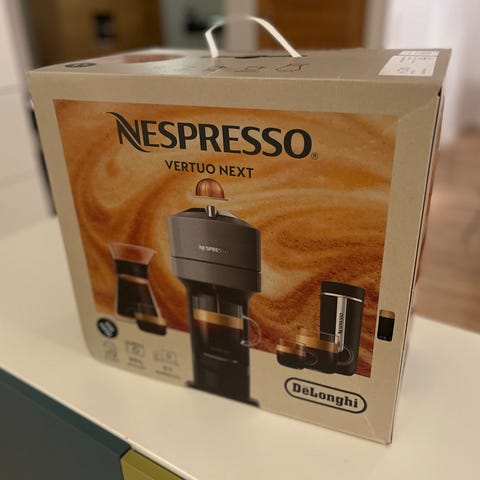 Helt ny kaffemaskine med en pakke kaffe kapsler.