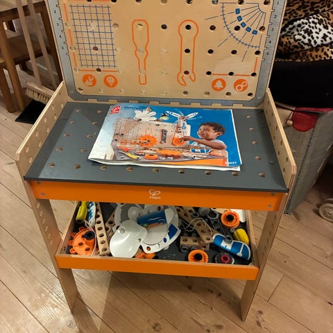 Fin lejetøjsbænk med ekstra kasse bygge til for højde. Kan løftes af for lavere bænk.