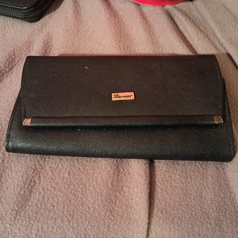 Damepung i ægte firben, mørkebrun med "guld" lås/kanter. To rum til mønter samt mindre rum mellem disse. L 15,5 x B 7 cm. Kan sendes for købers regning eller afhentes i 9230 Svenstrup eller 9492 Blokhus