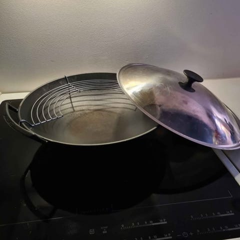 Meget lækker og meget stor vintage wok i emaljeret jern. Super flot har et lille emalje afslag på hanken. Den lidt mørkere stribe på kanten er ikke et emaljeafslag men en stribe i mørkere farve. Ellers er farven mørkere orange med hvid inderside. Den er magnetisk og kan derfor også bruges til induktion.