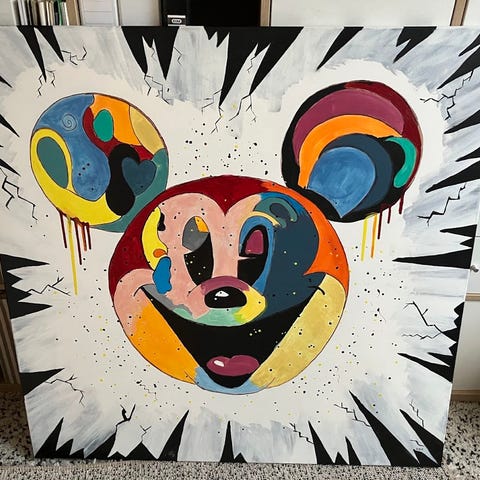 Billedet måler 43 x 33 cm incl ramme. Trykt på kraftigt karton. Original sketch of Mickey and Minnie from 'Mickey's Rival 1936.Printed in England. Published by The Art Group Limited, London. Billedet er i fin stand. Glas og træ