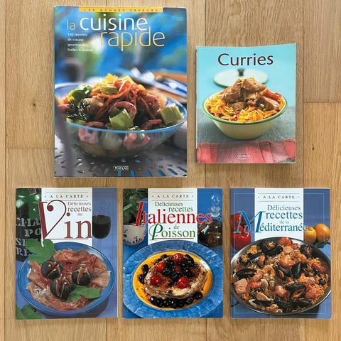 To franske kogebøger (på fransk) i den store serie fra Marabout Chef. Meget gedigent lavet, man får rigtig godt udbytte af at benytte dem. Serien er meget omfattende, så derfor kom jeg til at anskaffe mig dobbelte eksemplarer af disse to. Bøgerne er begge på 119 sider. Udgivet i henholdsvis 2006 og 2007. Prisen er pr. stk.