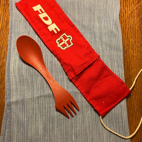Spisegrej, lygter, remme, drikke kopper/flaske noget med FDF logo på andet uden.