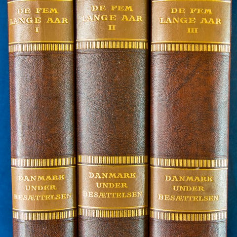 Danmark under Besættelsen., COUR, VILH. LA, år 1946, 1. udg udgave, Westermann, 1946. 748 + 755 + 750 s. Hlvldr. Pænt sæt. Rigt ill. med fotos i s/h., Vurdering 500 læderryg kom med et bud ønsker 300