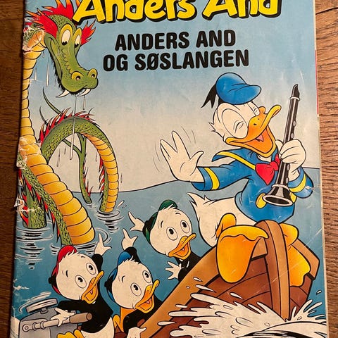 Solohæfte 1954 Nr. 21 - Anders And og Søslangen. Gammelt klassiske solohæfte. Leveres i beskyttende plastiketui med pap bagved. Opslaget i midten er løst - se det sidste billede. Ellers ok stand i betragtning af bladets alder 😊