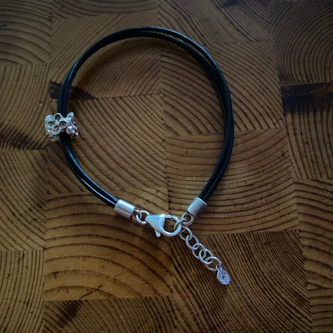 Sort, flettet læderarmbånd med lås og kæde i sølv (925), dertil 3 glasperler med midte af sølv (925).