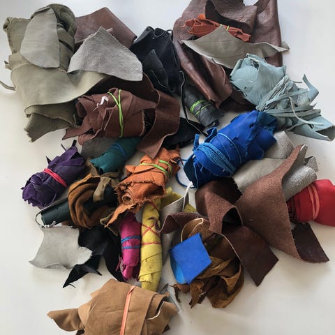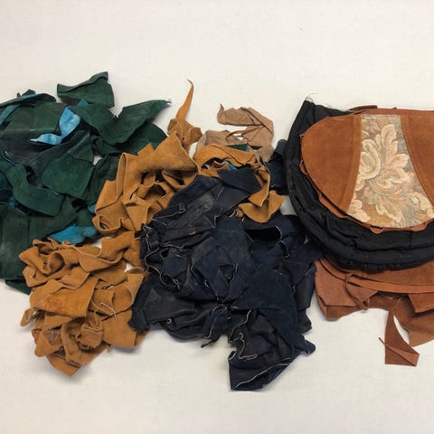 Skind, skindrester, Skindrester og ikke færdiggjordte patchwork veste,