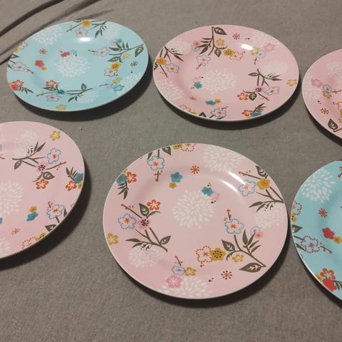 Frokosttallerken i plast. Brugt 1-2 gange. Der er 12 blå og 18 grønne. Genanvendelige