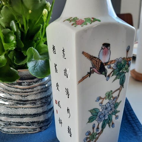 1 STK KINAVASE MED SMUKKE MOTIVER AF BLOMSTER ,SAMT DAME! PÅ HVID BUND !!MÅLER I HØJDEN 11 CM !! PRIS 50 KR !!