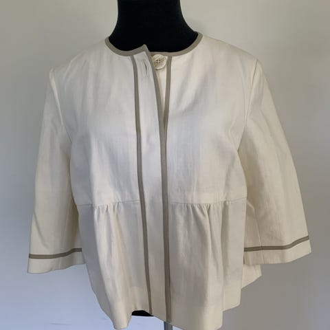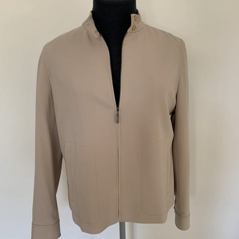 En sort blazer fra Jaeger, som er et engelsk high end brand, i størrelse 46 iflg. englænderne, det vil mere være en 44 i Danmark. Blazeren er kort, længden er kun cirka 52 cm, medens brystmålet er cirka 118 cm, det vil sige, at blazeren er tæt på at være en såkaldt bolerojakke. Blazeren er fremstillet af 69% bomuld og 31% viskose, medens foret er fremstillet af 100% polyester. Blazeren har skrålommer og hægtelukning se billede 3 og specielt billede 4.