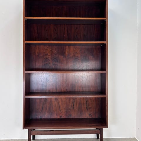 Johannes sorth bogreol i fineret psæisander opsat på massivt stel