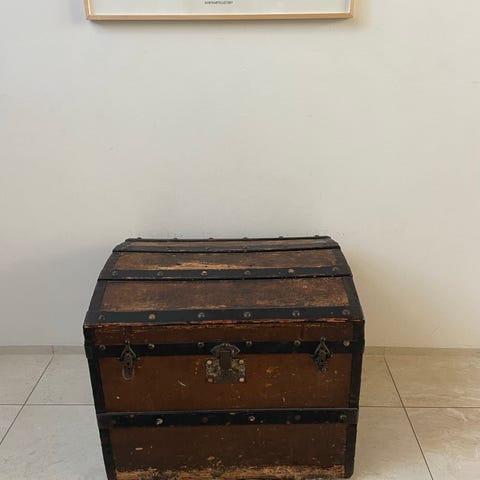 Antik metalkiste på hjul