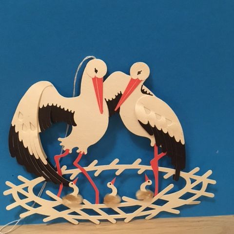 Smuk og dekorativ stork, fremstillet i malet træ. Den er lavet som en uro, hvilket gør at den bevæger vingerne op og ned.