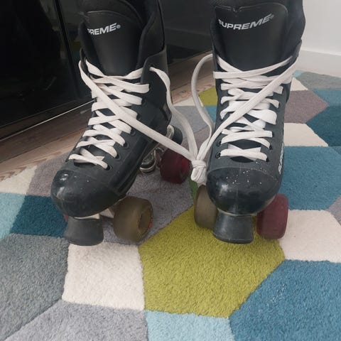 Tre år gamle men næsten ubrugte supreme 33 rulleskøjter sælges. Fremstår nye uden brugsspor. Fejlkøb så fik aldrig rigtig brugt dem. Kvittering haves. Nypris 1588kr