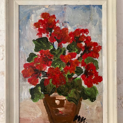 Maleri, motiv: Blomster/person, b: 70 h: 70, Ny pris 1000. På rund plade