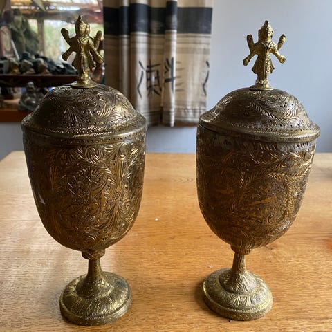 Smuk håndgraveret messing skål med detaljerede dyre motiver (gazeller ) og florale mønster. Stammer formentlig fra Kashmir / Persisk , ca 1900 tallet. Patina indvendigt, hvilken giver den et flot antikt udtryk. højde 13 cm diameter 15 cm
