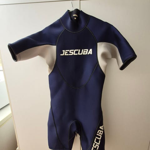 God kraftig kvalitet Jescuba våddragt herre (S) med korte ærmer og buks. Næsten ikke brugt. God kraftig lynlås. Fungerer perfekt.