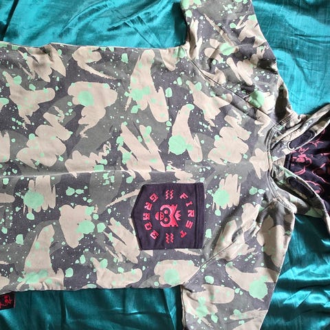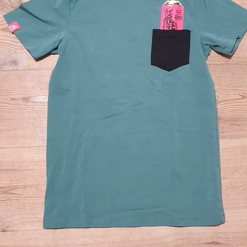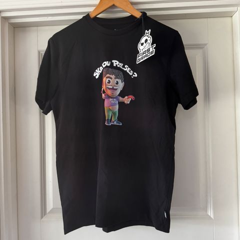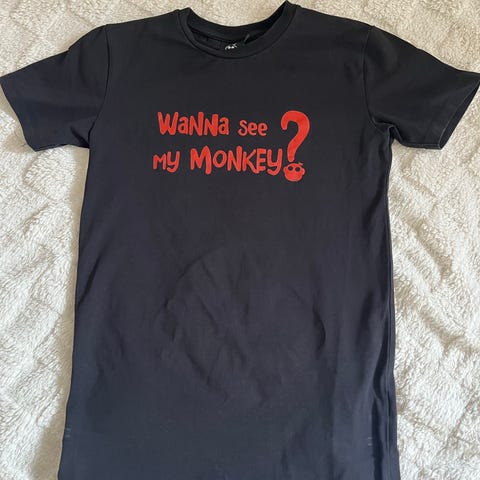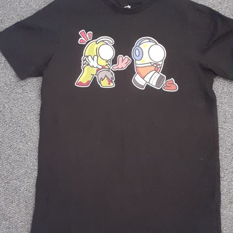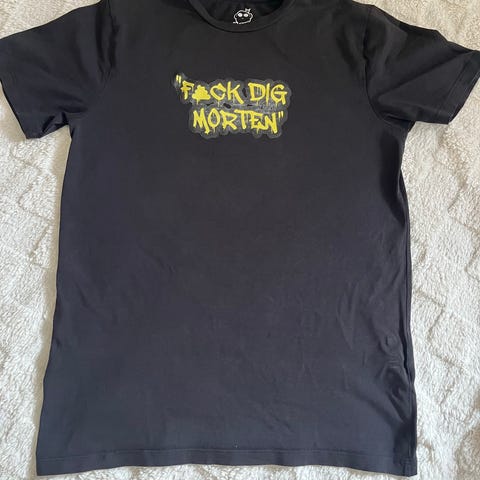 Den er ikke brugt særlig meget, så den fejler intet. Ingen huller, pletter eller slid (se billeder) hvor der ses at mærkerne på t-shirten ikke er slidt.