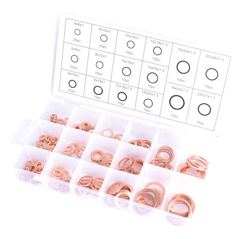 Stort sortimentsæske med kobberskiver 5x9x1 30stk. 6x10x1 30stk 6x12x1 30stk. 8x12x1 30stk 8x14x1 30stk. 8x14x1,5 15stk. 9x14x1 30stk. 10x14x1 30stk 10x14x1,5 15stk. 10x16x1 30stk. 12x16x1,0 30stk. 12x16x1,5 15stk. 12x18x1,5 15stk. 13x18x1,0 30stk. 14x18x1,5 15stk 14x20x1,5 15stk. 14x20x2,0 10stk. 16x20x1,5 15stk. 16x22x1,5 15stk. 18x22x1,5 15stk. 18x24x1,5 15stk. 20x24,5x1,5 15stk. 20x24,5x1 10stk. 19x26x2 10stk. 22x27x1,5 15stk. 22x29x1,5 15stk. 24x32x2 10stk. 26x34x2 10stk. 28x36x2 10stk.