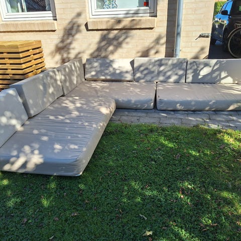 Rigtig fine og behagelige hynder fra Atleve til pallesofa. De kan tåle vand og er kun 1 år gamle.