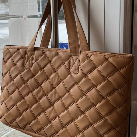 Kun det lækreste skind man kan få, syet med dobbelt syninger i siderne og med møbelsyning i bunden så tasken er stæk til det den skal bruges til.... shopping 😉