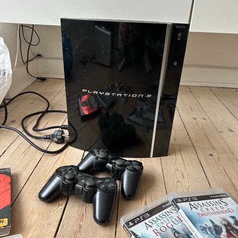 Sony Playstation 3 konsol i sort farve. Inkluderer 3 controllere og opladerkabel. Ideel til gaming og underholdning.