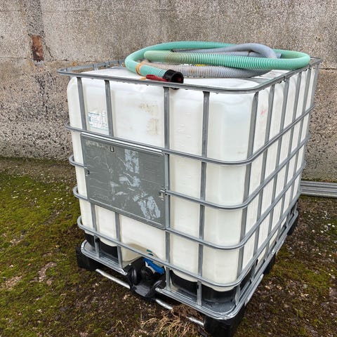 Palletank 1000 liter i sort som ikke får vandet til at rådne så hurtigt som en klar tank..kun bund prop...hane sæt kan købes på div hjemmeside..