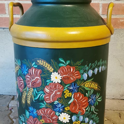 Sælger galvaniseret retro mælke junge. Højde med låg er ca 35 cm, diameter forneden er ca 16,5 cm. Patina i form af rust forekommer. Kan slibes og sprayes med galvanisering.