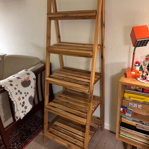 Stigerreol / Reolhylde i træ, malet hvid. Den er velegnet til fx badeværelse, køkken eller som opbevaring i andre rum.