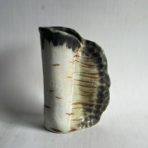 Særpræget arkitektonisk formgivet vase/urtepotte i stentøj. Fremstår stærk og solidt stående på grunden. Som et bygningsværk. Signeret med en for mig ukendt signatur.