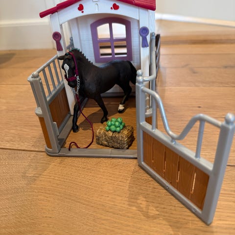 Svensk legestald i god stand til den hesteglade pige. Vil passe fint til heste fra fx Schleich.