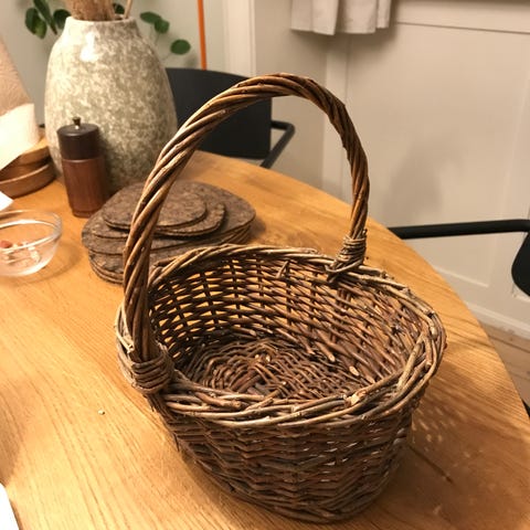 Super fin lille ældre massiv flettet messing kurv med hank.