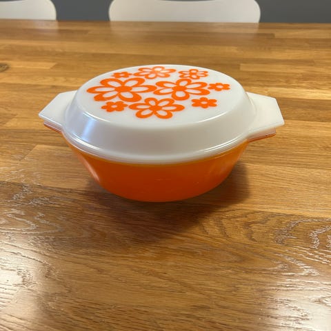 Pyntet med grøntsager, ingen låg til, men er holdt pænt, brugt som pynte skål, har en dia. 16 cm og højde 5,5 cm.