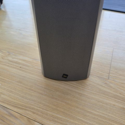Fået en skade da de væltede i en papkasse så cirka 5cm kant bagpå er brækket af(går ikke se når den er oppe. Samt der er kommet et indtryk på fremsiden af den ene højtalere. Se billederne. Tror det går at åbne og trykke den tilbage.