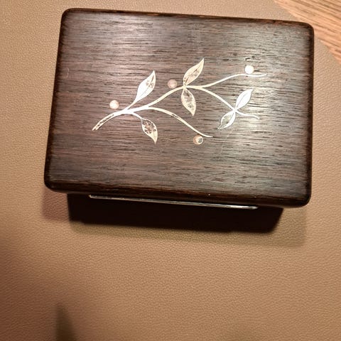 Indonesisk skrin købt i Indonesien og måler 50 cm i længde og 31 cm i bredde og 22 cm i højde. I træ og messing.
