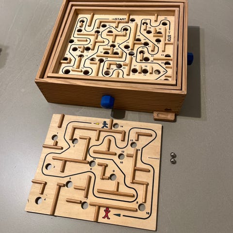Labyrint kuglespil, familiespil, andet spil, Ældre labyrint kuglespil. Selve spillet er i flot stand. Med 2 kugler. Kassen bærer præg af at være af ældre dato.