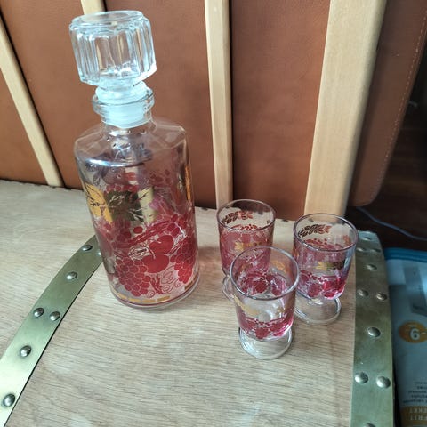 Smukke 2 karaffeler m 8 gl. i røde farver m 24 karats guld .