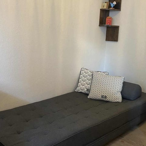 Sælger day bed med 5,4 cm tyk grå hynde med lys strib. Sengen kan klappes sammen, når den ikke bruges. Er meget lidt brugt. Meget velholdt. Er købt som gæste seng.