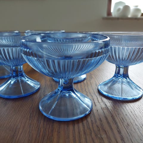 Glas, 3 isglas/skåle i Blåt glas, Blåt glas, 3 stk Smukke franske og ubrugte is skåle/dessert glas. De er ubrugte og fremstår i flot flot stand.