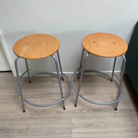3 taburetter i bøgelaminat med patina. Gråt stålstel.