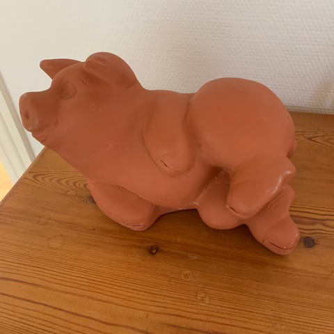 Sparegris, ler, Antik sparegris i ler. L: 18 cm. H: 10 cm.