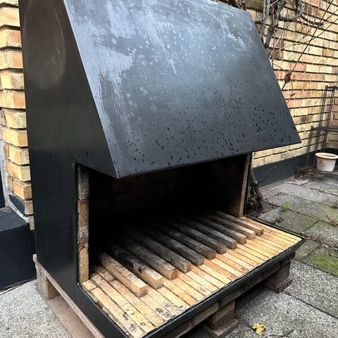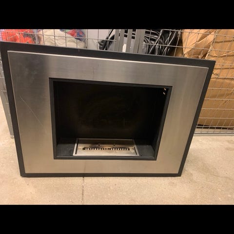 Cubus nr. 1 vægmonteret pejs af jernplader, indvendigt med ildfaste tegl, bagvendt udtag. Gnistfanger samt monteringsbeslag medfølger.