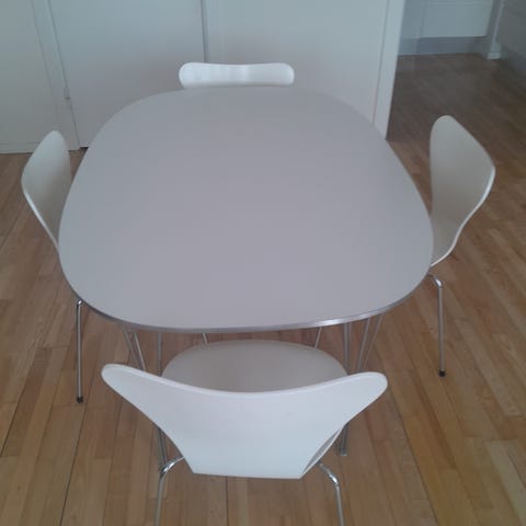 Super Ellipse spisebord, plade med hvid laminat med kant af matpoleret aluminium, monteret med spændben af forkromet stål. Fremstillet hos Fritz Hansen år 1992. H. 70 cm. L. 150 cm. B. 100 cm. Fremstår med lette brugsspor.