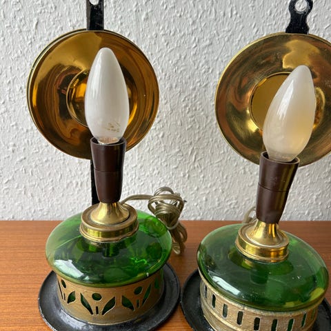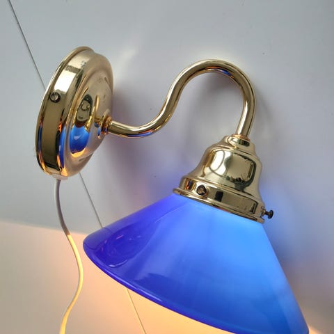 Vintage væglampe med gul glasskærm. Lampen har et klassisk design med messingdetaljer og er velegnet til indendørs brug. Passer godt til stue, soveværelse eller gang. Fra væg til centrum 16cm, diameter 12cm, højde 22cm.