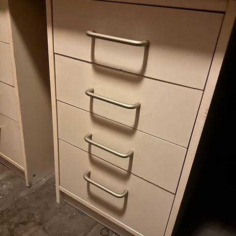 9 stk flotte patinerede antikke arkivskuffer med messingdetaljer. En udtræksskuffe med messingbøjle på hver samt messingramme til at indeksere. Indre mål i A4 størrelse. Skufferne "går i hak" så de står meget stabilt og kan stables i antal efter eget valg.