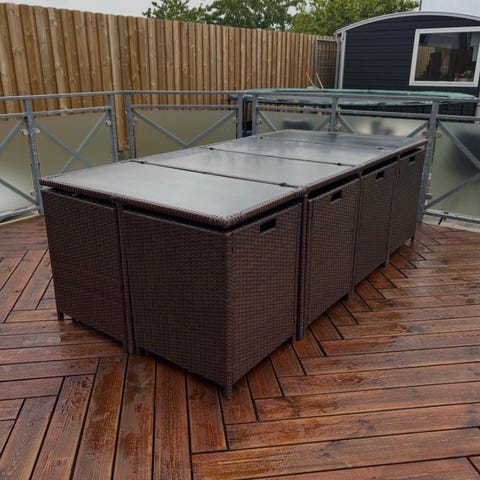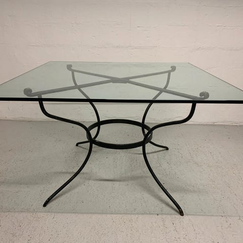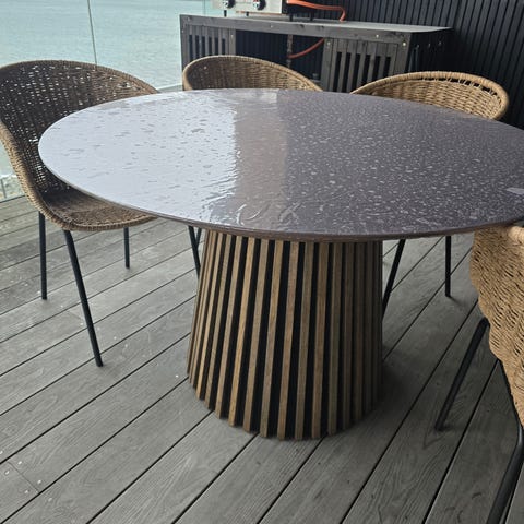 Stort og stilrent spisebord med 3D-printet glas, der har en fantastisk struktur takket være det grå betonmønster. Flotte detaljer, såsom at bordpladen fortsætter ud over kanterne på de korte sider.