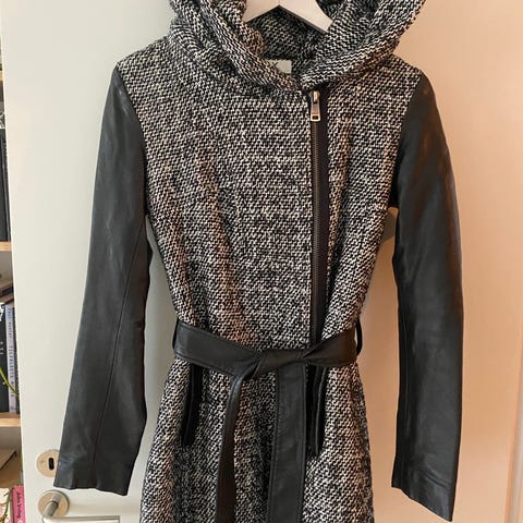 Blød uld/ kashmir jakke med pepitatern, dobbelt brystet lukning med 2 knapper, 2 lommer foran, inderfór ud i ærmerne.